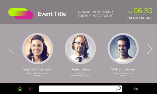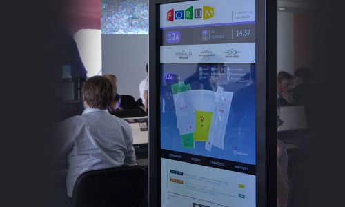 The navigation system is an interactive map of the exhibition or forum, intuitive route building and display of the program of events and speakers. Everything at your fingertips! In addition, hotkeys, online map updates, advertising options, and the ability to display emergency or informational messages are available. Your new event navigation experience.